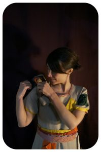 Grâce aux choix du public, elle passe d’une histoire à une autre à l’aide d’objets nichés dans sa robe. Contes, chansons, devinettes se suivent et se répondent de manières aléatoires offrant une racontée à chaque fois différente.