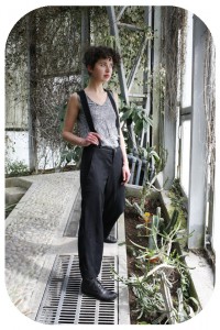 Pantalon Salopette Le pantalon à bretelles revisité. J’ai travaillé une matière fluide, à l’imprimé discret et de bonne tenue, permettant de porter ce vêtement de manière élégante et détendue. photos Maxime Brygo